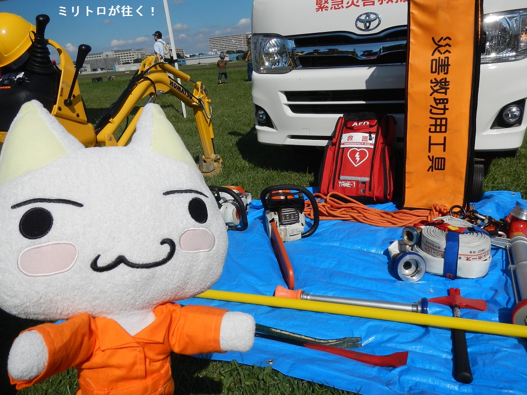災害救助用の工具や小さなショベルカーの展示があったニャ~