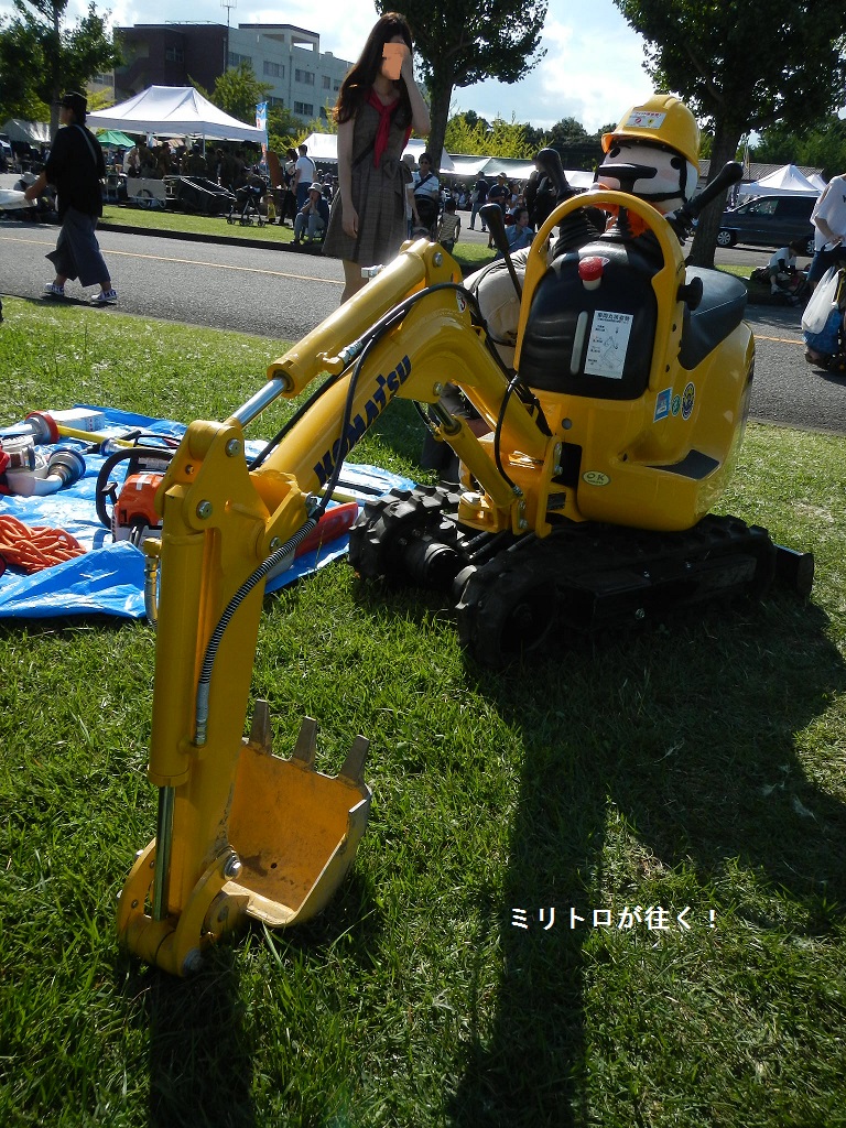 災害救助用の工具や小さなショベルカーの展示があったニャ~
