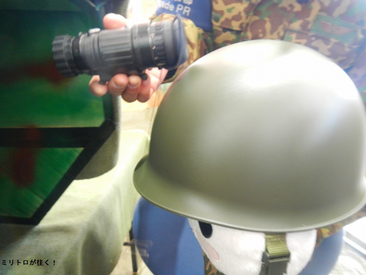 暗視装置は手に持って使うんじゃなくて、こんな感じにヘルメットに暗視装置を取り付けて…