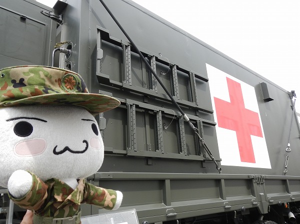 赤十字を付けた四角い車があったので、中に入れてもらったニャ