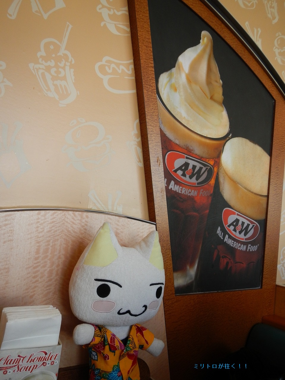 次の日は、A&Wのハンバーガーショップに行きましたニャ。
