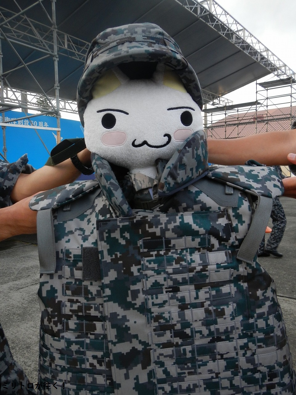 二人の隊員さんに補助されながら、空自ピクセル迷彩の防弾ベストを着せてもらったニャ